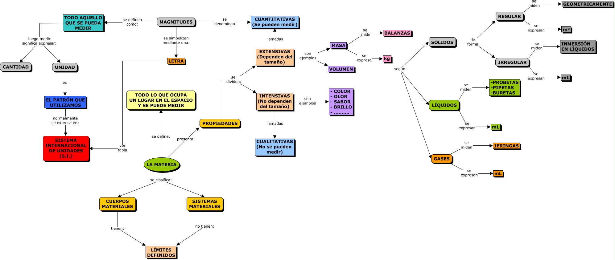 Este Cmap, tiene información relacionada con: propiedades de la materia_02.cmap, VOLUMEN según SÓLIDOS, INTENSIVAS (No dependen del tamaño) son ejemplos - COLOR - OLOR - SABOR - BRILLO - .........., IRREGULAR se expresan mL, UNIDAD es EL PATRÓN QUE UTILIZAMOS, GASES se expresan mL, SISTEMAS MATERIALES no tienen: LÍMITES DEFINIDOS, CUERPOS MATERIALES tienen: LÍMITES DEFINIDOS, LA MATERIA se define: TODO LO QUE OCUPA UN LUGAR EN EL ESPACIO Y SE PUEDE MEDIR, REGULAR se expresan <math xmlns="http://www.w3.org/1998/Math/MathML"> <mrow> <mmultiscripts> <mtext> m </mtext> <none/> <mtext> 3 </mtext> </mmultiscripts> </mrow> </math>, VOLUMEN según GASES, LA MATERIA presenta: PROPIEDADES, MAGNITUDES se simbolizan mediante una: LETRA, TODO AQUELLO QUE SE PUEDA MEDIR luego medir significa expresar: CANTIDAD, PROPIEDADES se dividen: INTENSIVAS (No dependen del tamaño), LÍQUIDOS se expresan mL, MAGNITUDES se denominan CUANTITATIVAS (Se pueden medir), LA MATERIA se clasifica: SISTEMAS MATERIALES, EL PATRÓN QUE UTILIZAMOS normalmente se expresa en: SISTEMA INTERNACIONAL DE UNIDADES (S.I.), LA MATERIA se clasifica: CUERPOS MATERIALES, SÓLIDOS de forma IRREGULAR