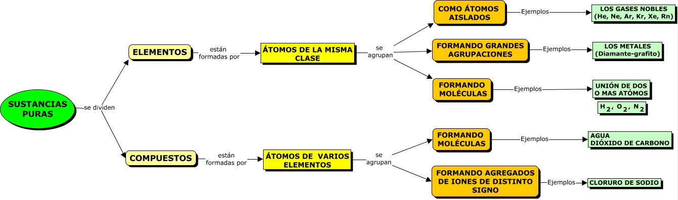 Este Cmap, tiene información relacionada con: sustancias puras, SUSTANCIAS PURAS se dividen COMPUESTOS, FORMANDO AGREGADOS DE IONES DE DISTINTO SIGNO Ejemplos CLORURO DE SODIO, FORMANDO MOLÉCULAS Ejemplos AGUA DIÓXIDO DE CARBONO, COMPUESTOS están formadas por ÁTOMOS DE VARIOS ELEMENTOS, ELEMENTOS están formadas por ÁTOMOS DE LA MISMA CLASE, SUSTANCIAS PURAS se dividen ELEMENTOS, ÁTOMOS DE VARIOS ELEMENTOS se agrupan FORMANDO AGREGADOS DE IONES DE DISTINTO SIGNO, ÁTOMOS DE LA MISMA CLASE se agrupan FORMANDO GRANDES AGRUPACIONES, FORMANDO GRANDES AGRUPACIONES Ejemplos LOS METALES (Diamante-grafito), ÁTOMOS DE VARIOS ELEMENTOS se agrupan FORMANDO MOLÉCULAS, ÁTOMOS DE LA MISMA CLASE se agrupan COMO ÁTOMOS AISLADOS, COMO ÁTOMOS AISLADOS Ejemplos LOS GASES NOBLES (He, Ne, Ar, Kr, Xe, Rn), ÁTOMOS DE LA MISMA CLASE se agrupan FORMANDO MOLÉCULAS, FORMANDO MOLÉCULAS Ejemplos <math xmlns="http://www.w3.org/1998/Math/MathML"> <mtext> UNIÓN DE DOS